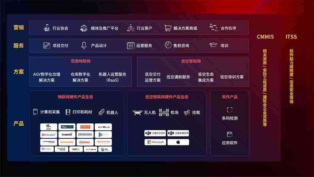 聚合国内外先进的物联网硬件产品品牌,,聚焦数字化仓储、、机器人运营、、、低空智联网等领域,,,,共同打造适合客户业务场景的解决方案并提供交付服务